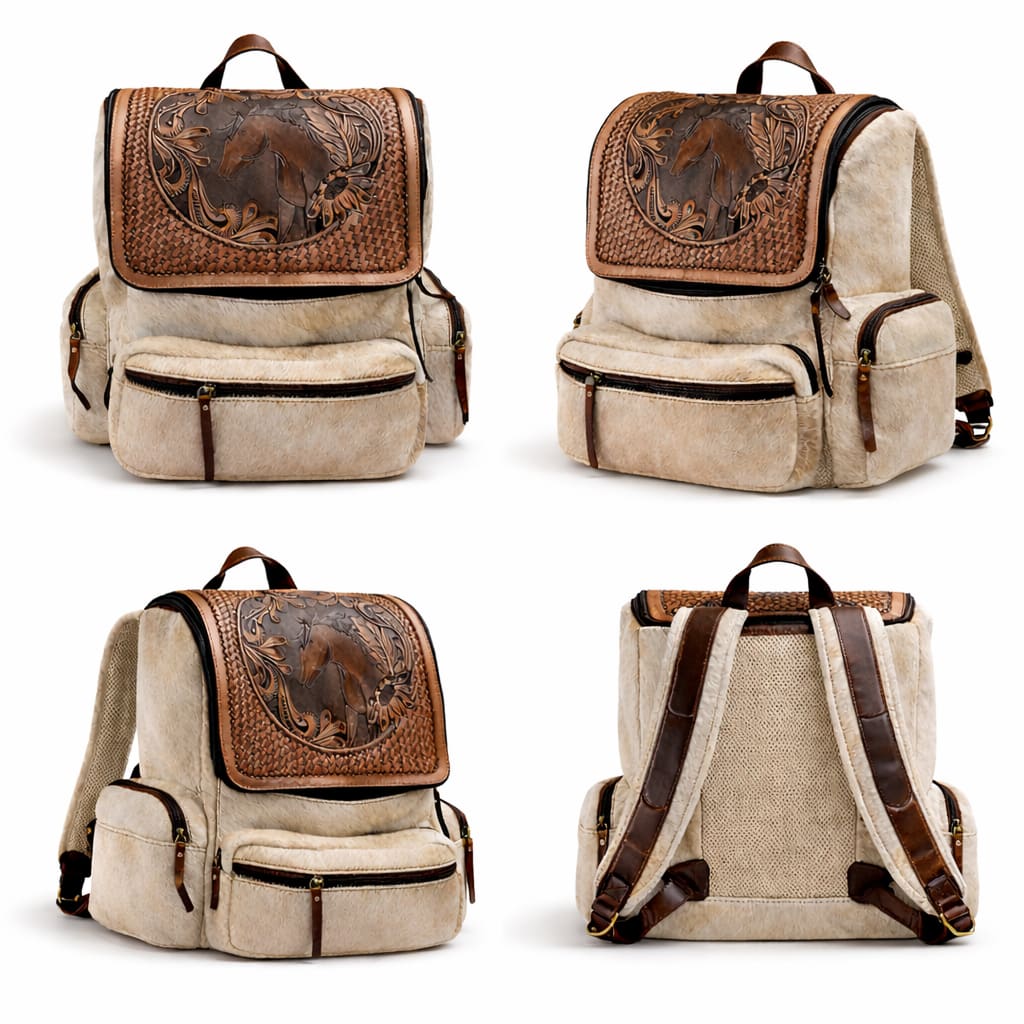 A premium handcrafted backpack made from authentic buffalo hide leather featuring natural black and white hair-on-hide texture. The bag is highlighted by a beautifully hand-tooled brown leather flap with intricate floral carvings, showcasing traditional leather craftsmanship. Designed for both style and durability, this backpack includes multiple zippered pockets for organized storage, adjustable leather shoulder straps for comfort, and strong stitching for long-lasting use. The natural hair-on-hide pattern makes every bag unique, giving it a distinctive luxury appearance. Perfect for travel, daily use, college, or fashion styling, this backpack blends rustic elegance with modern functionality.