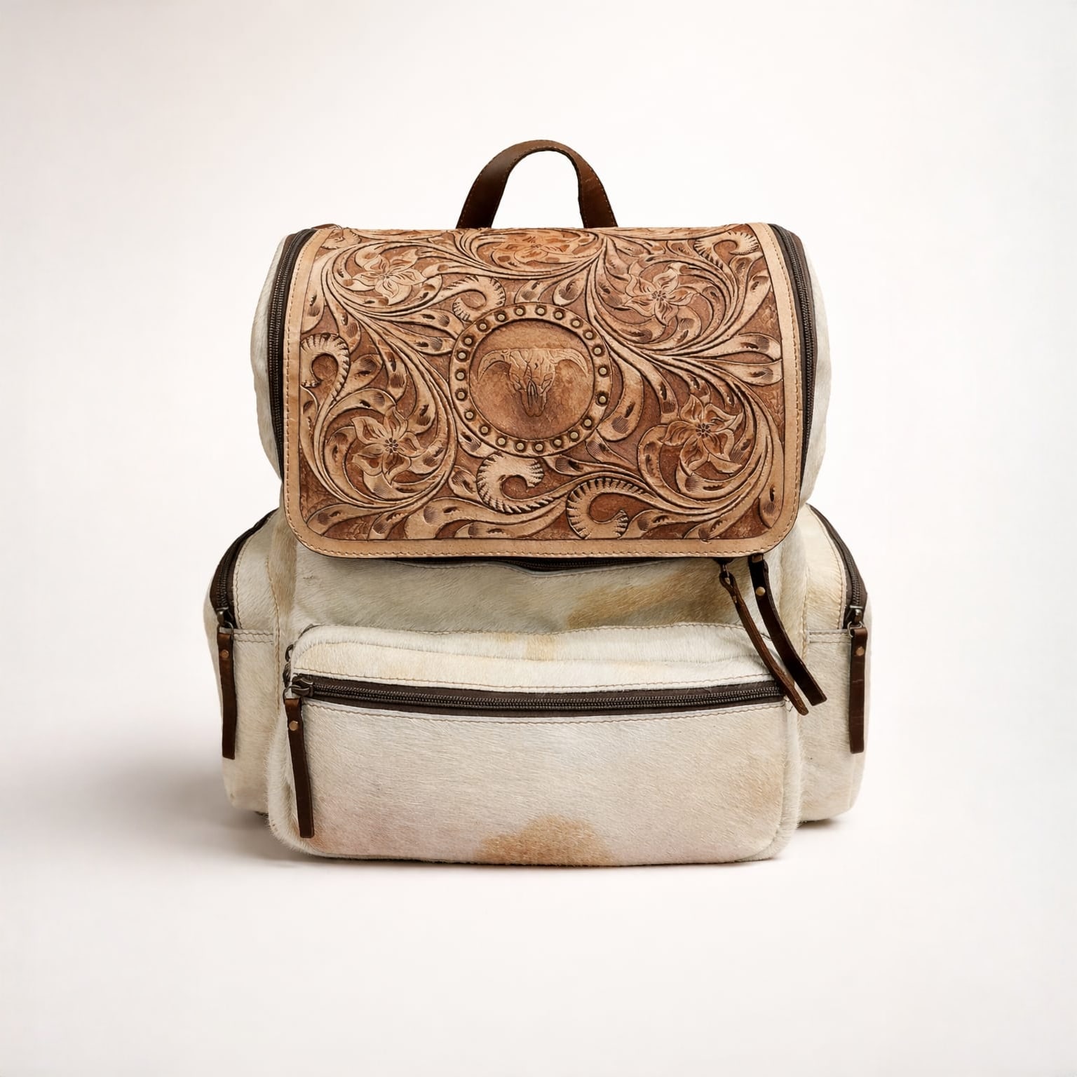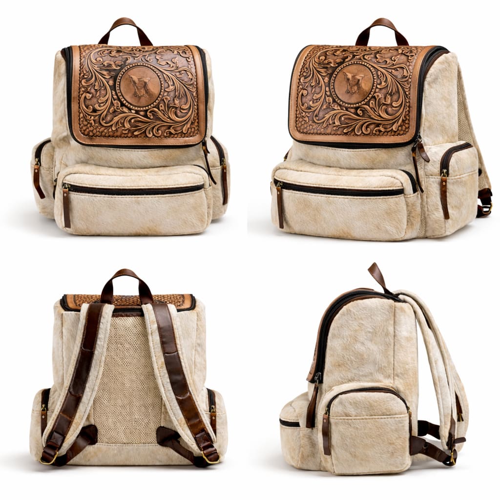 SAVE 25%A premium handcrafted backpack made from authentic buffalo hide leather featuring natural black and white hair-on-hide texture. The bag is highlighted by a beautifully hand-tooled brown leather flap with intricate floral carvings, showcasing traditional leather craftsmanship. Designed for both style and durability, this backpack includes multiple zippered pockets for organized storage, adjustable leather shoulder straps for comfort, and strong stitching for long-lasting use. The natural hair-on-hide pattern makes every bag unique, giving it a distinctive luxury appearance. Perfect for travel, daily use, college, or fashion styling, this backpack blends rustic elegance with modern functionality.