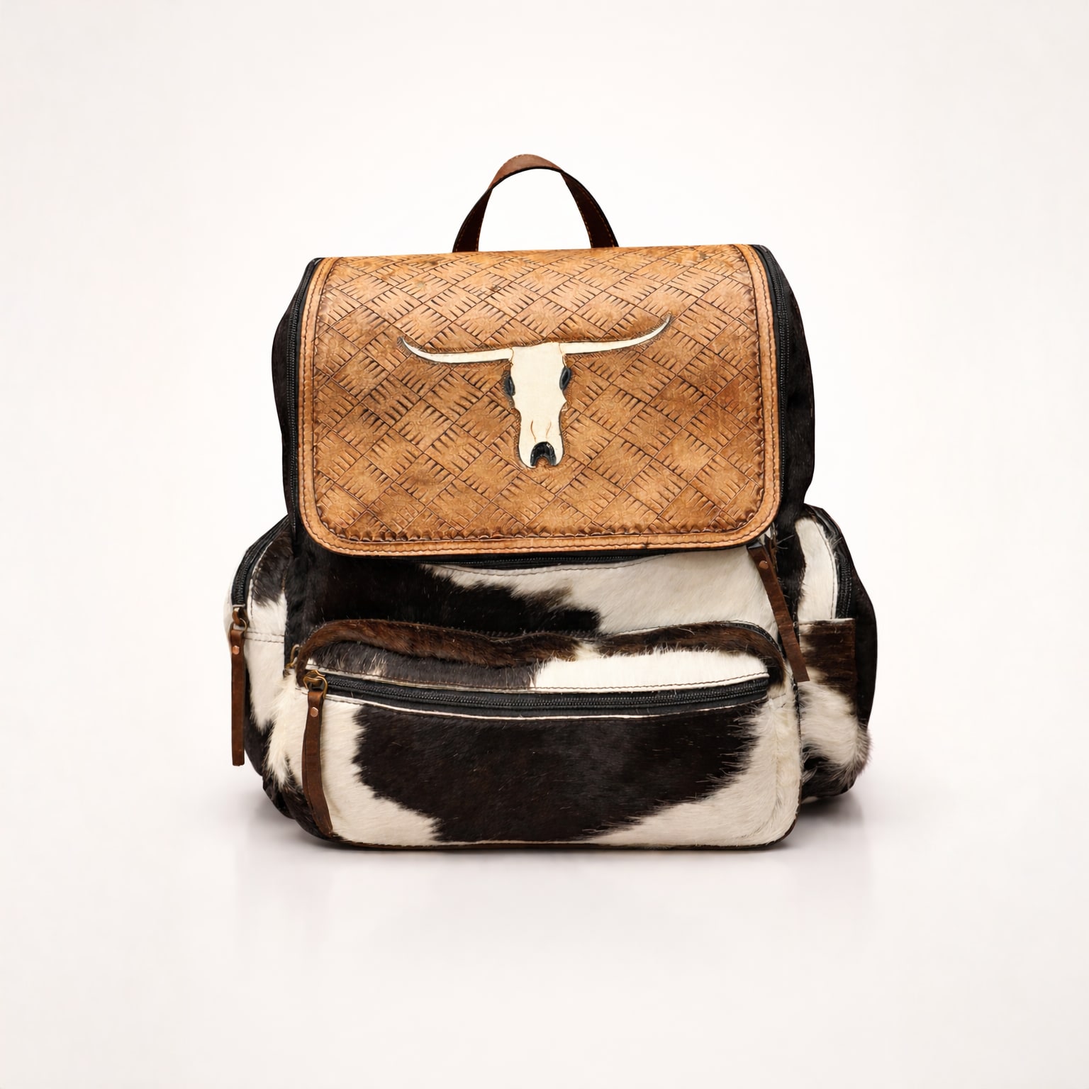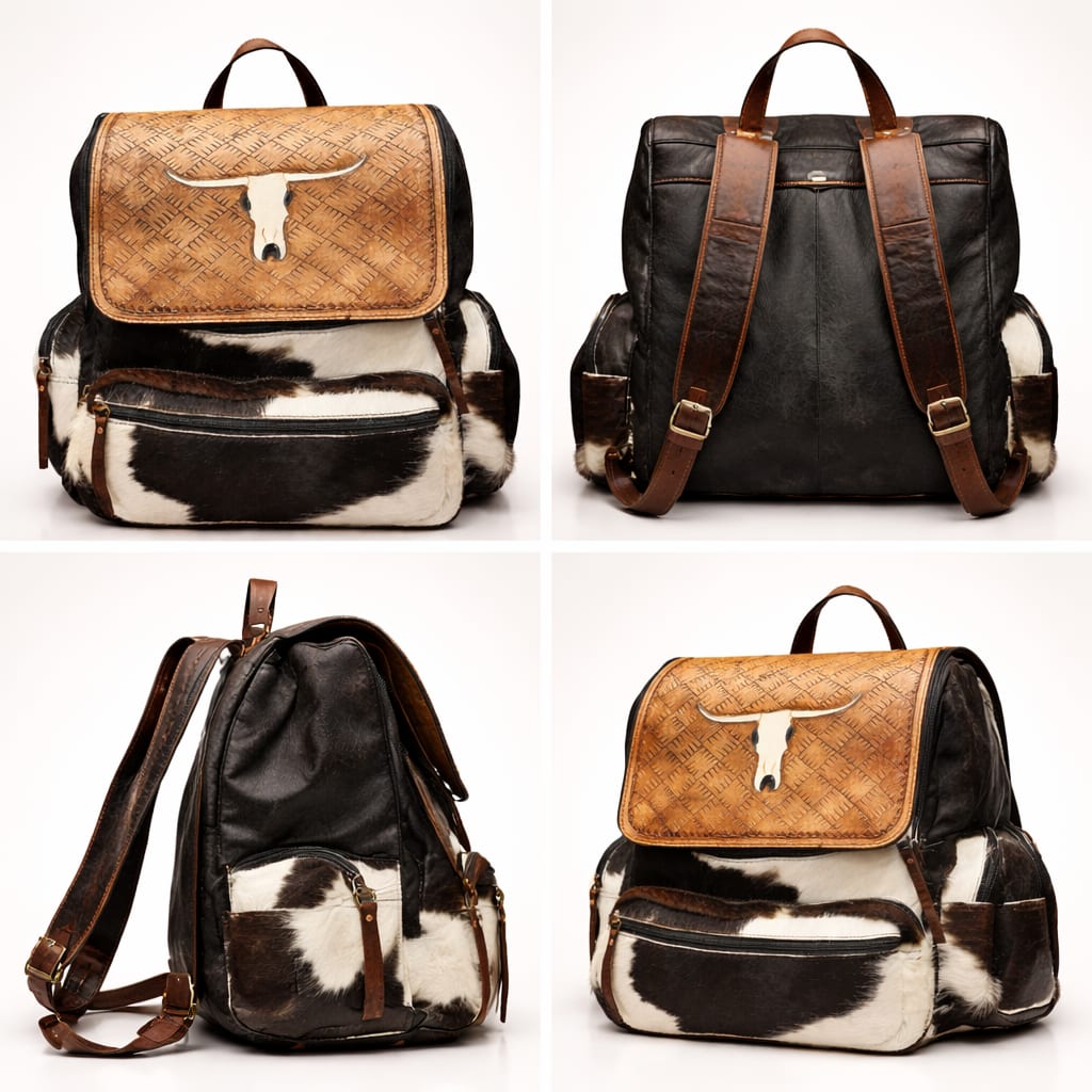 SAVE 25%A premium handcrafted backpack made from authentic buffalo hide leather featuring natural black and white hair-on-hide texture. The bag is highlighted by a beautifully hand-tooled brown leather flap with intricate floral carvings, showcasing traditional leather craftsmanship. Designed for both style and durability, this backpack includes multiple zippered pockets for organized storage, adjustable leather shoulder straps for comfort, and strong stitching for long-lasting use. The natural hair-on-hide pattern makes every bag unique, giving it a distinctive luxury appearance. Perfect for travel, daily use, college, or fashion styling, this backpack blends rustic elegance with modern functionality.