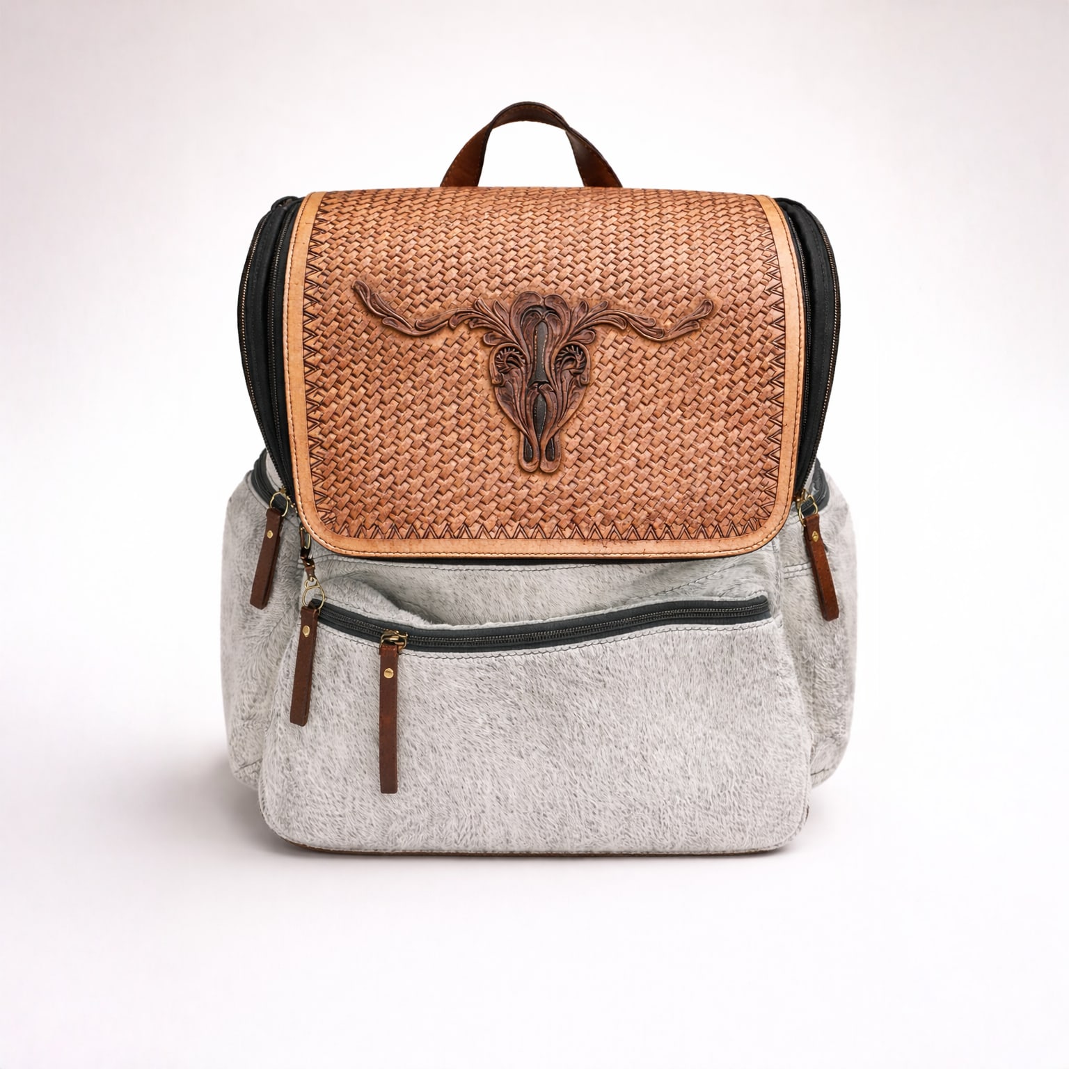 SAVE 25%A premium handcrafted backpack made from authentic buffalo hide leather featuring natural black and white hair-on-hide texture. The bag is highlighted by a beautifully hand-tooled brown leather flap with intricate floral carvings, showcasing traditional leather craftsmanship. Designed for both style and durability, this backpack includes multiple zippered pockets for organized storage, adjustable leather shoulder straps for comfort, and strong stitching for long-lasting use. The natural hair-on-hide pattern makes every bag unique, giving it a distinctive luxury appearance. Perfect for travel, daily use, college, or fashion styling, this backpack blends rustic elegance with modern functionality.