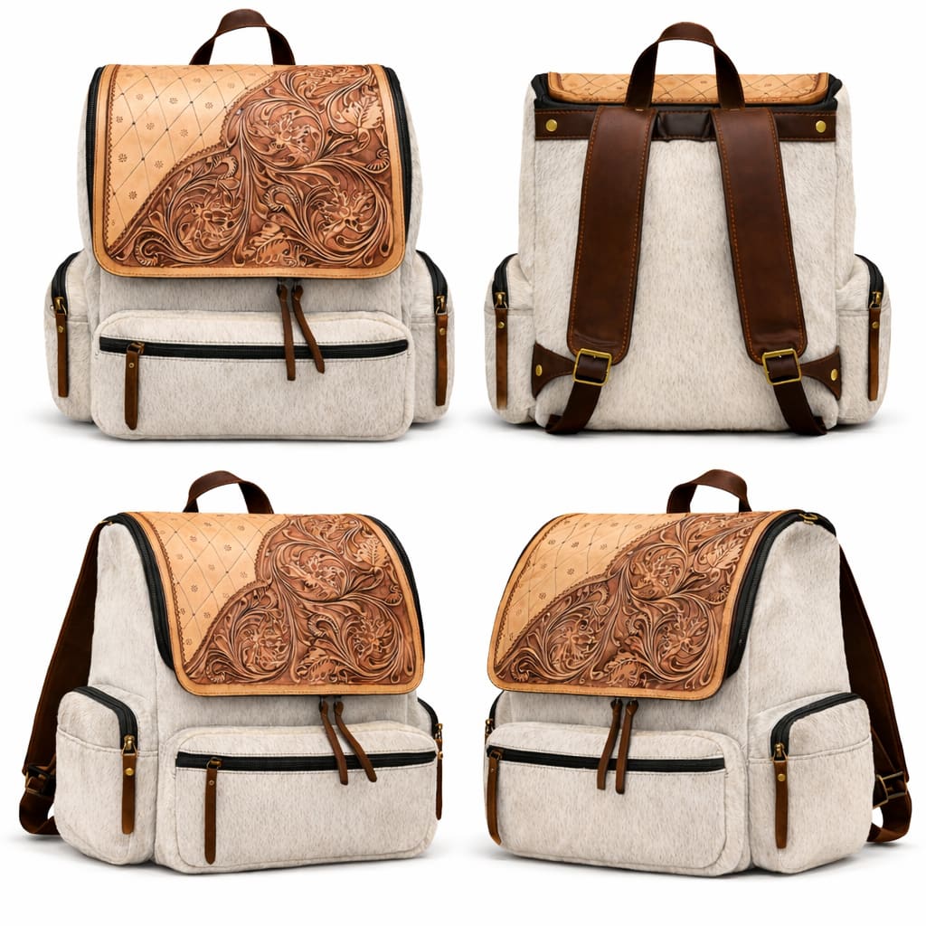 SAVE 25%A premium handcrafted backpack made from authentic buffalo hide leather featuring natural black and white hair-on-hide texture. The bag is highlighted by a beautifully hand-tooled brown leather flap with intricate floral carvings, showcasing traditional leather craftsmanship. Designed for both style and durability, this backpack includes multiple zippered pockets for organized storage, adjustable leather shoulder straps for comfort, and strong stitching for long-lasting use. The natural hair-on-hide pattern makes every bag unique, giving it a distinctive luxury appearance. Perfect for travel, daily use, college, or fashion styling, this backpack blends rustic elegance with modern functionality.